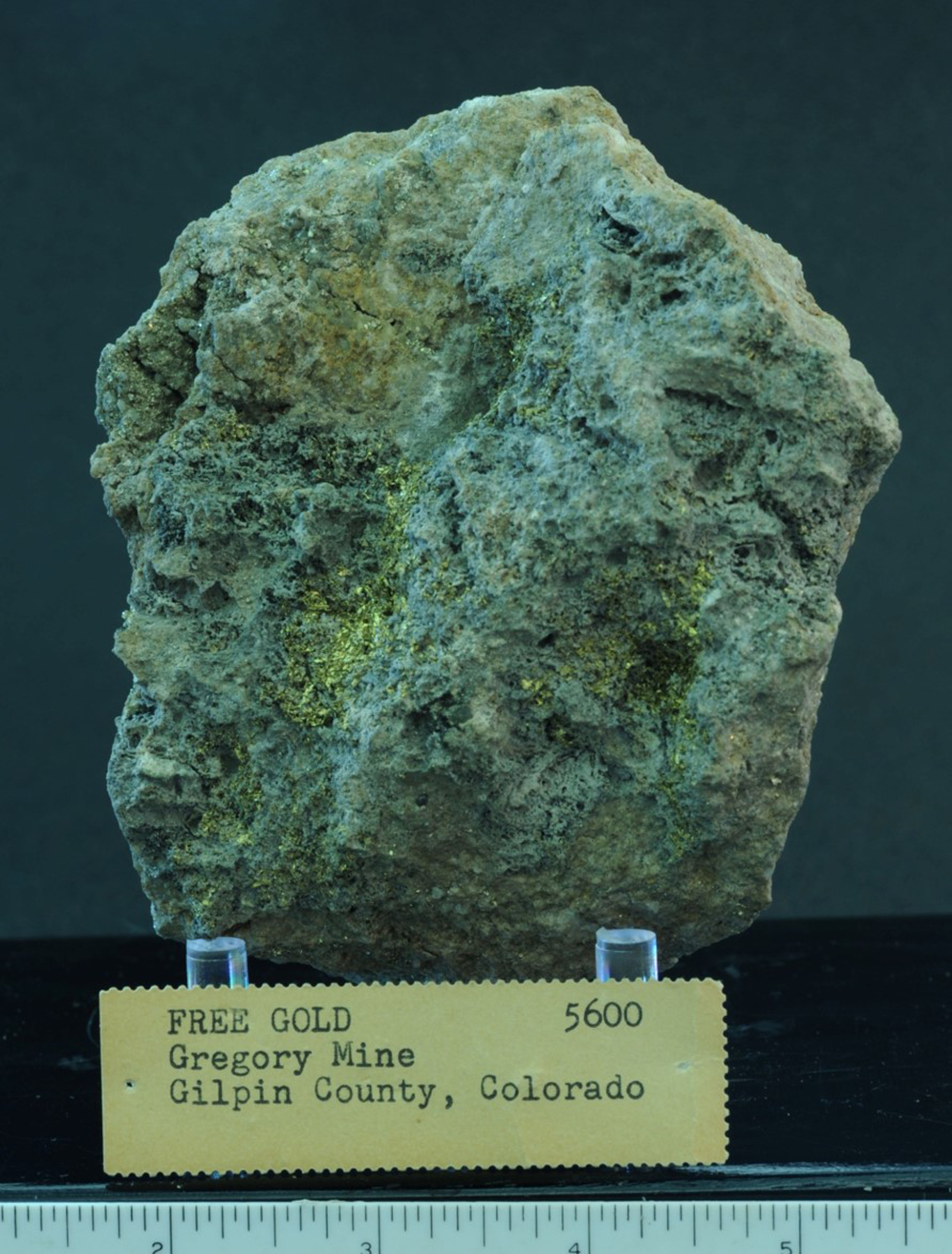 The photograph above shows a gold specimen on display at the Colorado School of Mines, and it carries the number 5600. This specimen has all the documentation to suggest that it is the original 5600, although no where is there any indication that it was donated by the original prospector. This does not mean the specimen on display is authentic. There are many reasons that the Colorado School of Mines piece could be a misrepresentation — including an attempt by someone at the School of Mines to cover up trading away the original Colorado Dragon. But that said, two specimens with the same number, and at least one of those with very questionable historical references? At the very least, one is left with a tremendous sense of uncertainty, and anger that such an important historical artifact is now tarnished. Ed Raines is the Collections Manager at the Colorado School of Mines Geology Museum, and one of the most knowledgeable professionals I know of in terms of Colorado minerals. Ed is also a bulldog – he pursues information with tremendous tenacity, and is a stickler for facts. He understands the importance of Gregory gold, and has scoured the records to shed light on the mystery. Along the way he found a third specimen labeled 5600, now in another private Colorado collection! Two is bad, three is ridiculous.