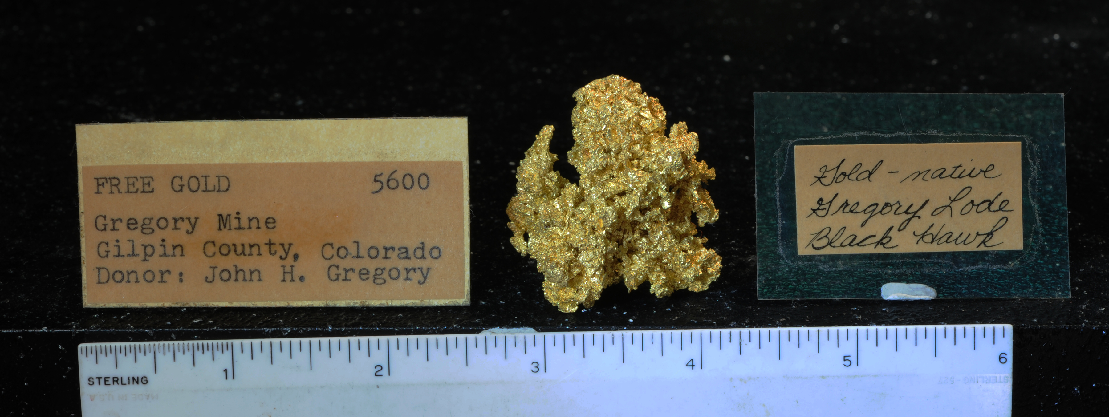 Recently, Pala Minerals published an article about the sale of arguably the most important Colorado mineral specimen — a gold sample from the early days of the Colorado’s rich mining history — in their internet newsletter (http://www.palaminerals.com/news_2014_v2.php). The specimen is fabulous – more than 5 ounces of crystallized gold that demands attention. The specimen is reputed to be from the Gregory Lode, Gregory Gulch, Gilpin County, Colorado – the label is shown below. The significance of the label is “Gregory” — as in John H. Gregory. Gregory, a prospector from Georgia, is credited with discovering the first major Colorado gold deposit located near what would become Central City, in May, 1859. Gregory sold his claims, and pretty much disappeared (although there are many Gregory legends, mostly they are unsubstantiated canard). The label changes the “Colorado Dragon” from a great mineral specimen and transforms it to a hugely signifiant historical artifact. Further, the mineral label states that the gold actually belonged to John Gregory, and that he had personally donated the treasure. There is absolutely no other evidence that Gregory collected or owned this outstanding gold, nor that he donated specimens, but the label titillates!
