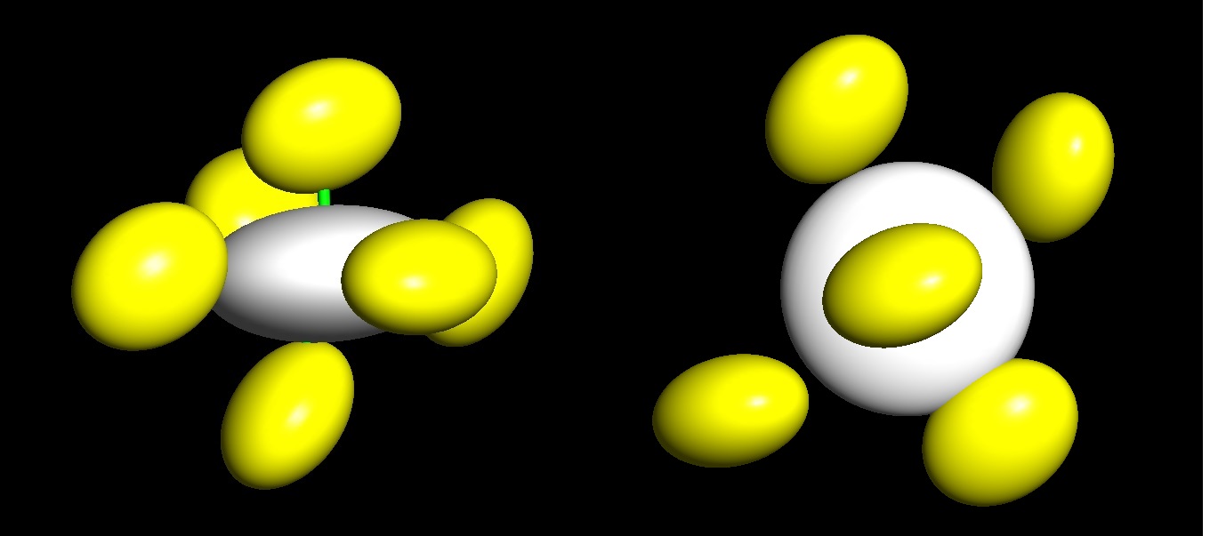 Interaction of silver atoms in proustite with neighboring sulfurs. On the left image, there are two bonds which are vertical and the four non-bonded S are in the horizontal plane. In the right image, the view is down the direction of the vertical bonds; the image shows the flat pancake shaped displacement ellipsoid which “cages” the silver. Figure courtesy of Bob Downs.