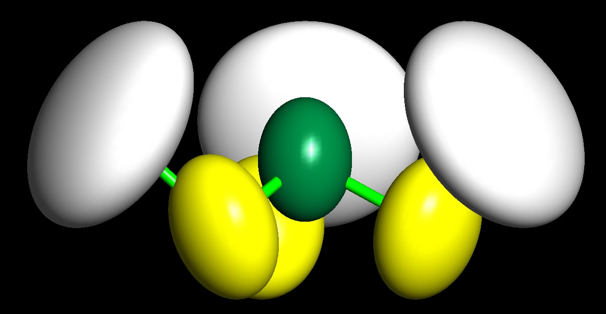 The classical representation of the atomic interactions in the unit cell does not capture the complexity of proustite very well; it is important to take a quantum view, more fully appreciating that the silver atoms are fickle with their attachment to a given sulfur atom. Below is an individual proustite molecule presented using Einstein’s model for the harmonic displacement of atoms. The ellipsoids represent an envelope of space with a certain probability that the atom is inside; in the figure sulfur is shown in yellow, arsenic in green, and silver is the in silver (of course!). The silver atoms have the largest ellipsoids — in fact, larger than the entire As-S3 pyramid dimension — reflecting the fact that silver wanders within the structure.