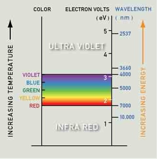 Color table for semi-conductors. The visible light spectrum covers a range of energies, and absorption is possible at all energies above the band-gap of the material, but not below. If the gap is very small (<1.5 eV) then all the light energies are absorbed and a black color is observed.