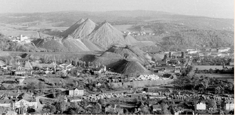 Waste dumps from the mining of uranium above Schlema. Photo was taken in 1960 (from the German government agency responsible for remediation).