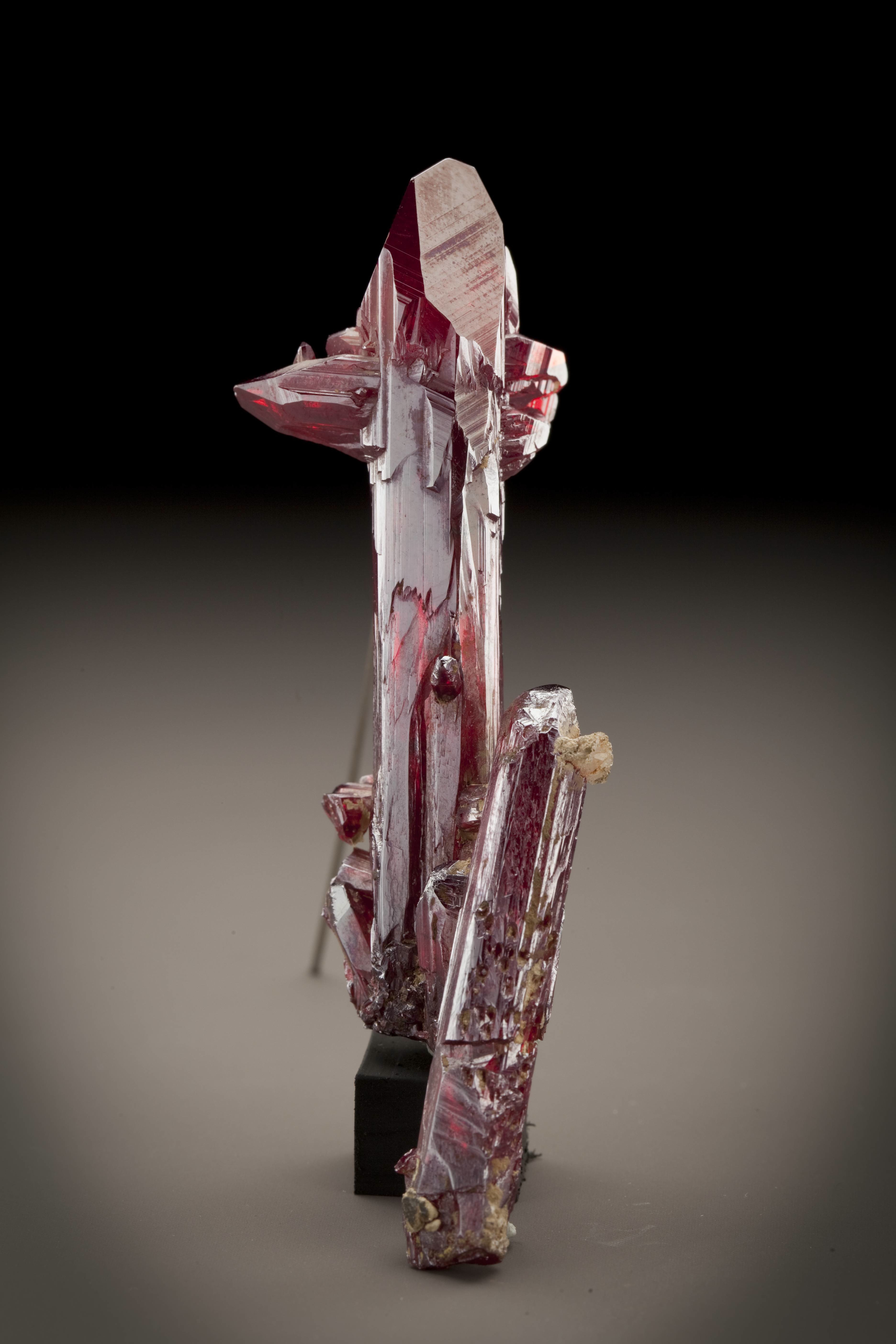 Proustite, Chanarcillo, Chile. This specimen was originally in the Vaux collection, and is now in the National Collection at the Smithsonian Institution. The main crystal is a little longer than 7 cm. Photograph provided by Paul Powhat.